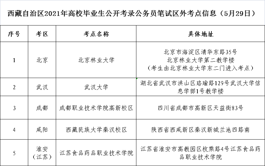 西藏自治区2021年高校毕业生公开考录(招聘)公务员(工作人员)笔试于5月29日-30日举行。为方便各位考生参加考试,现将区外各考区考点信息公布如下,请各位考生提前合理规划行程,按时参加考试。
