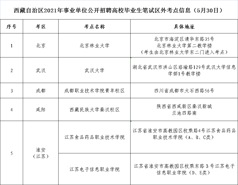 西藏自治区2021年公招考试笔试区外考区考点信息